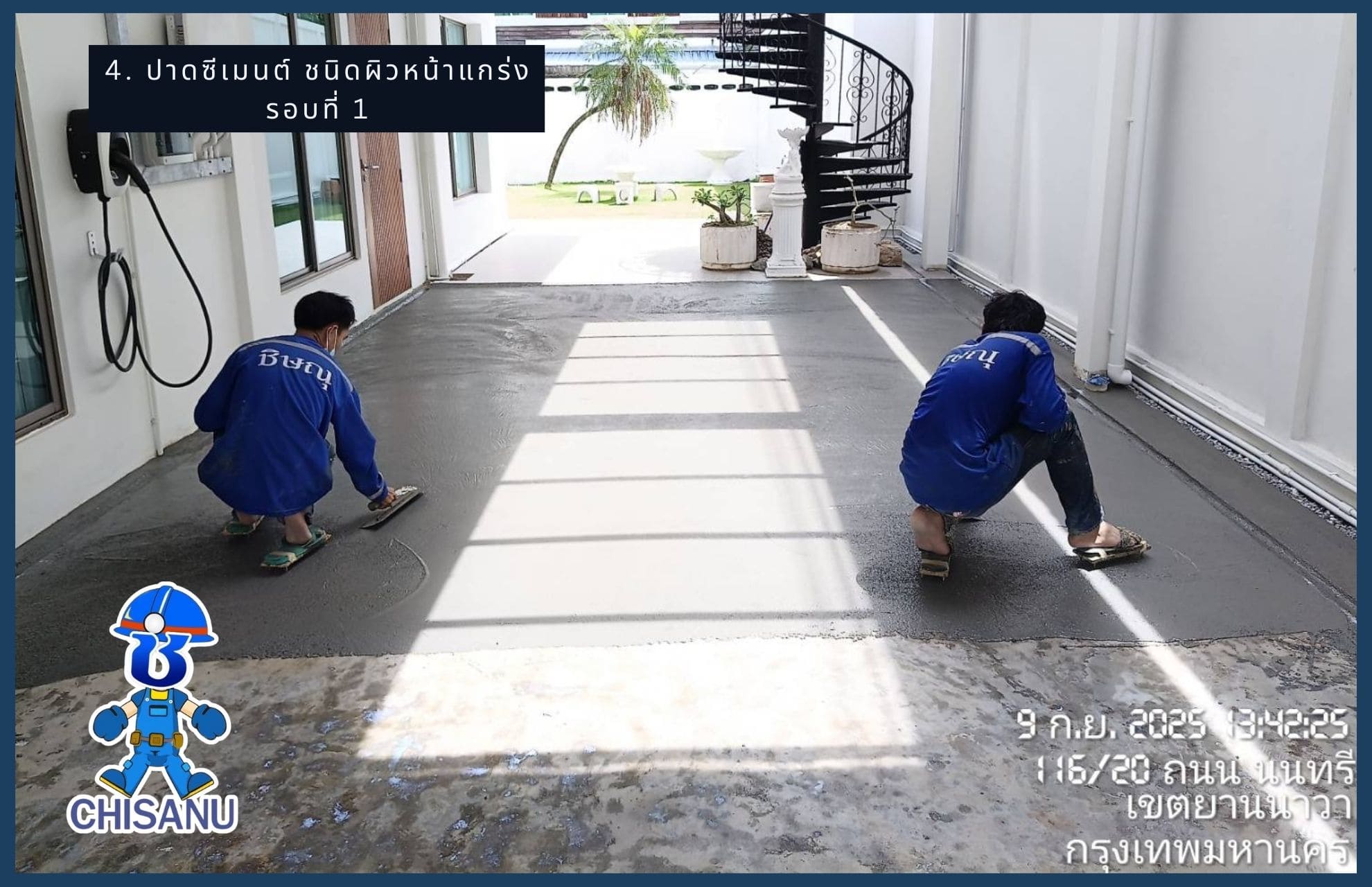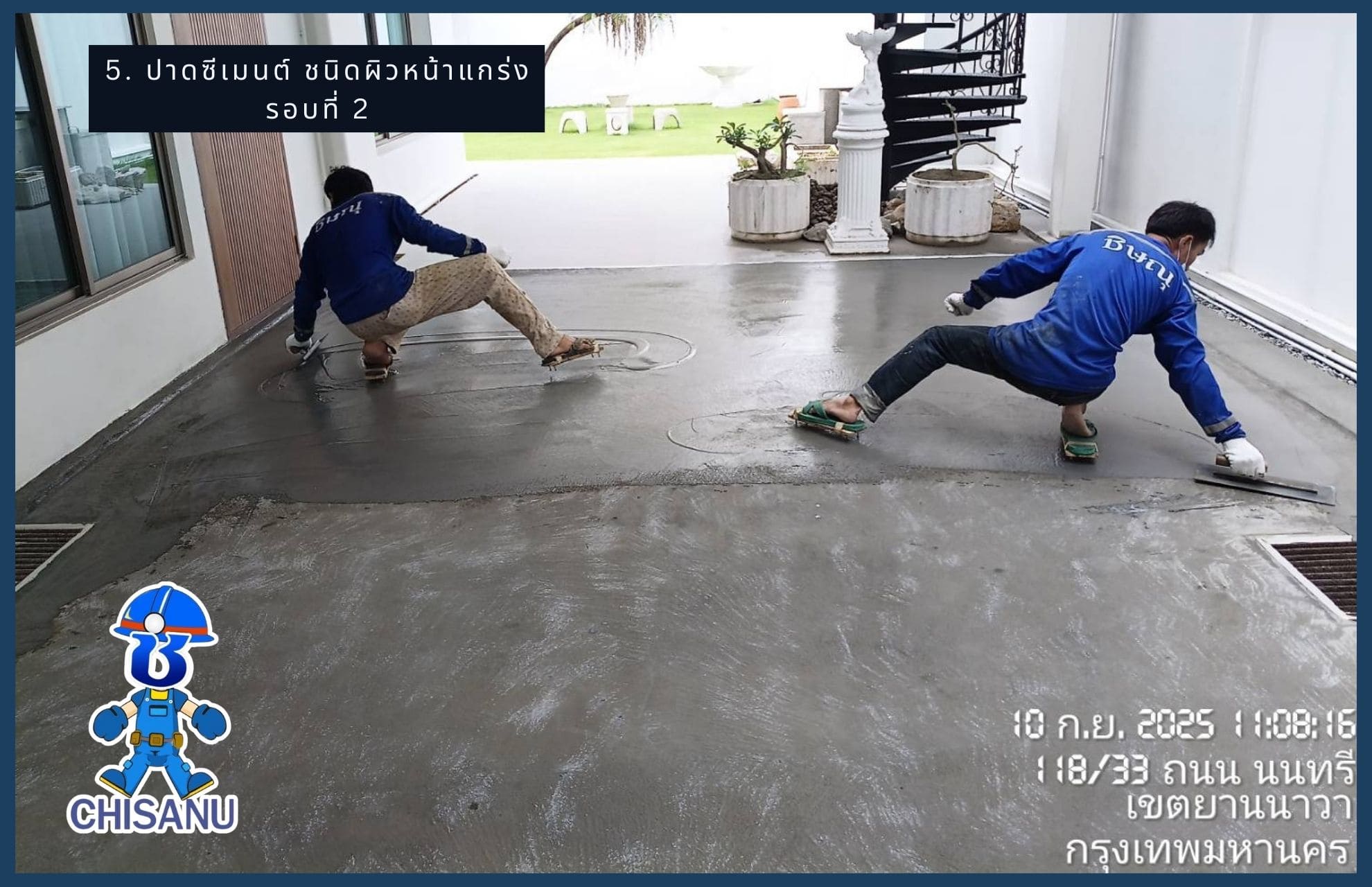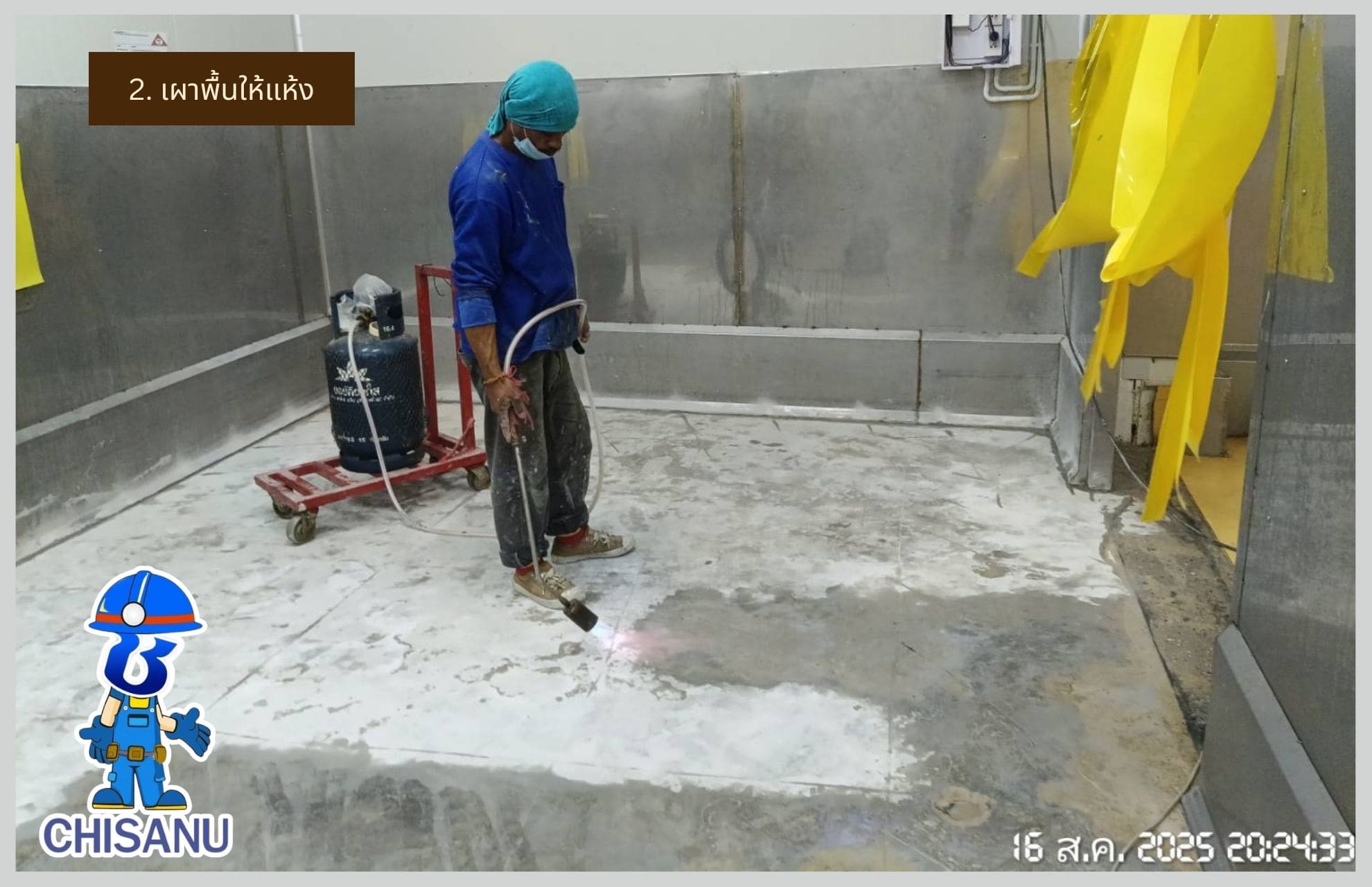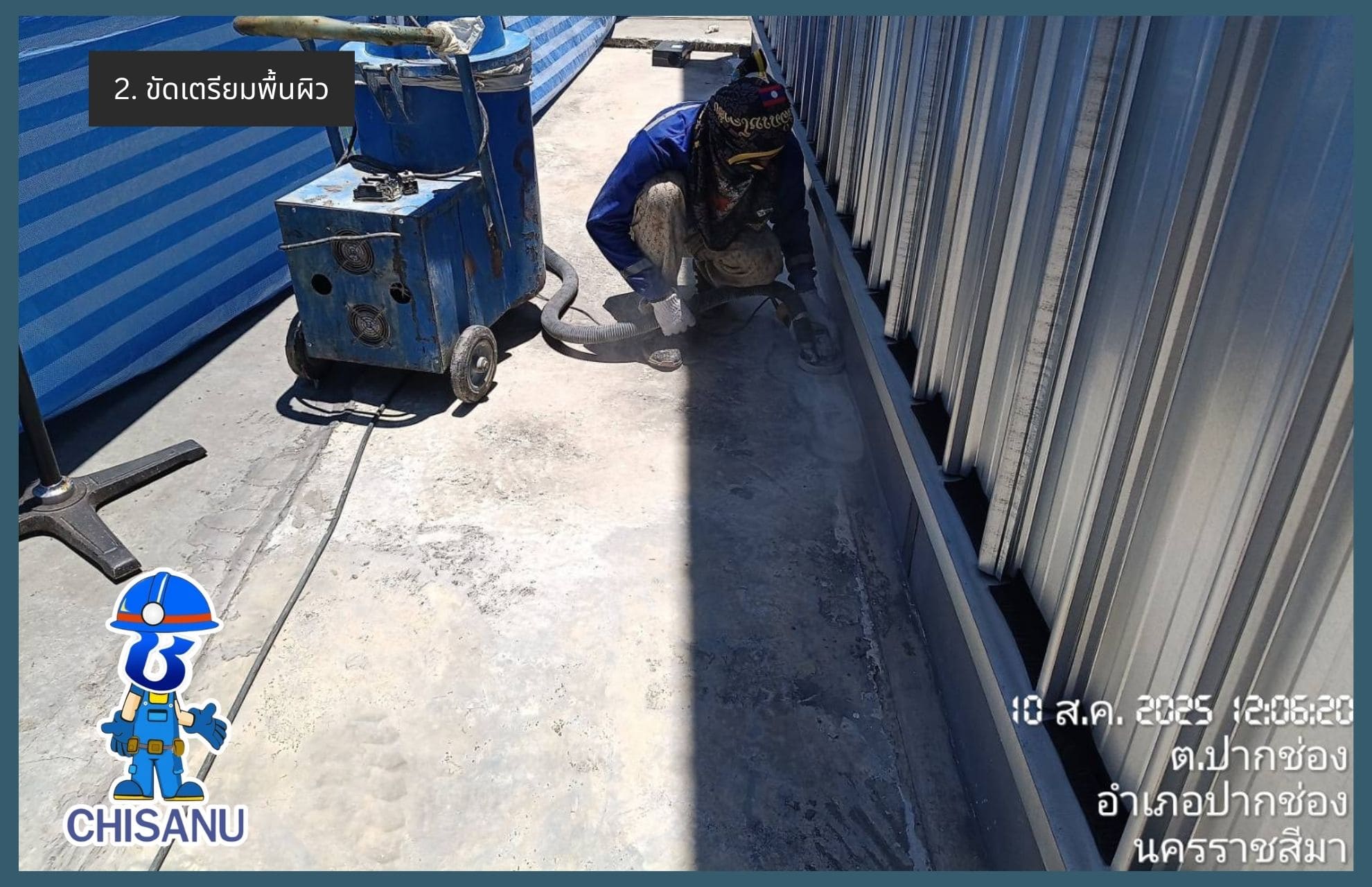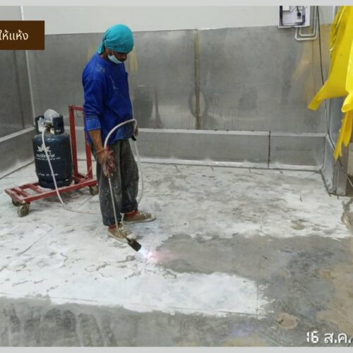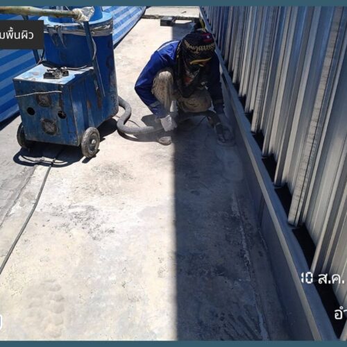 ซ่อมพื้นด้วย ซีเมนต์เคลือบผิวคอนกรีต ชนิดผิวหน้าแกร่ง และเคลือบทับหน้าด้วย PU Concrete หนา 4 มม. สีเทา #Gy02